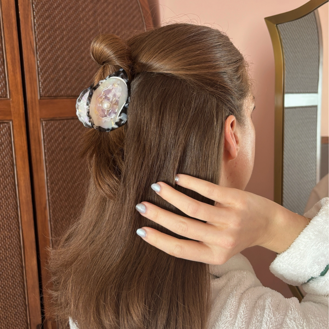 Oyster Claw Clip a stunning accessory that effortlessly elevates any look, whether you're heading out for a chic dinner or enjoying a relaxing beach trip. Crafted with a pearl embellishment, this claw clip not only offers functionality but also adds a touch of elegance to your hairstyle.