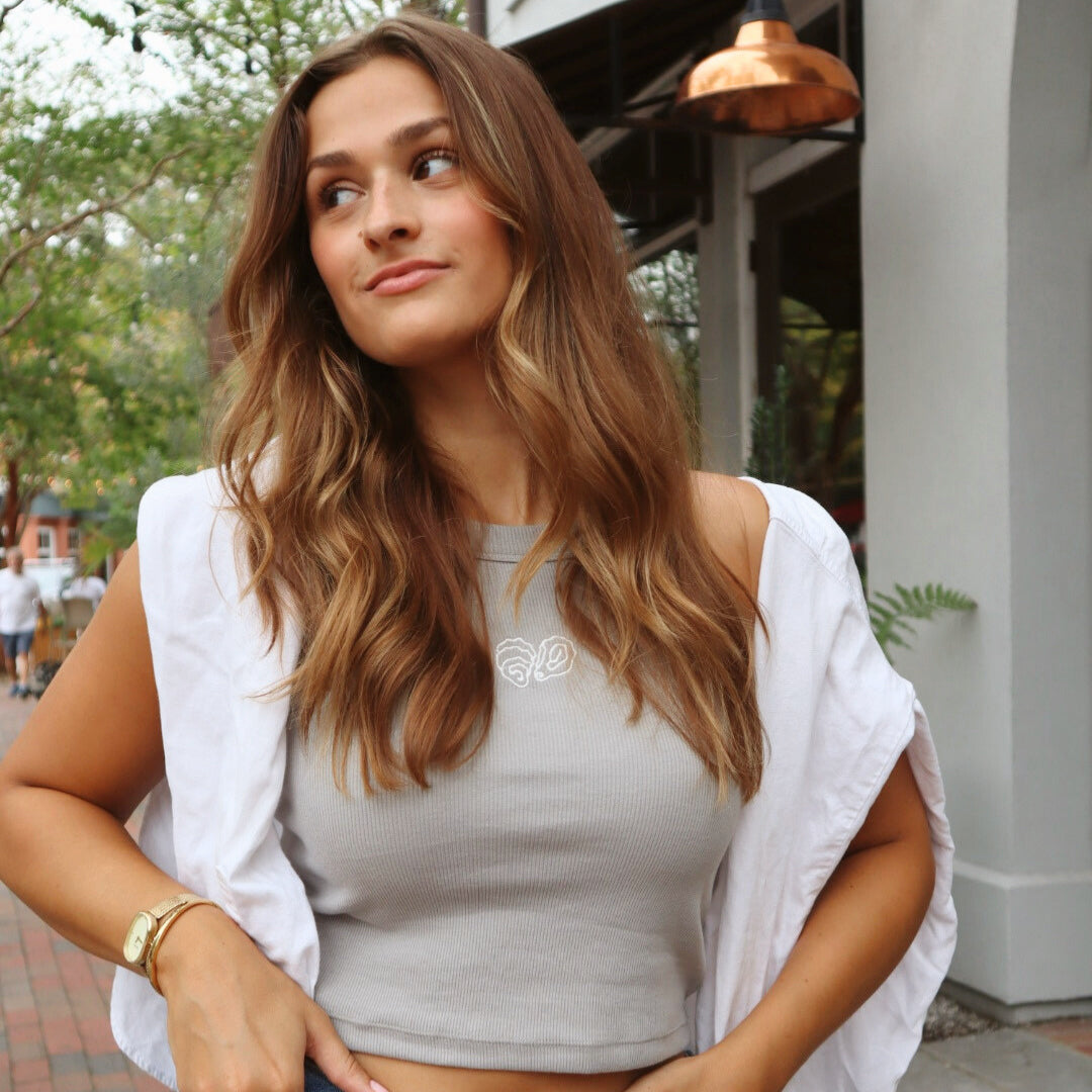 This tank top is the perfect blend of comfort and coastal cool. The stormy color is a nod to the ocean's moody side, while the delicate oyster embroidery adds a touch of seaside charm. Crafted from a soft, stretchy blend of 95% cotton and 5% polyester, it's perfect for those laid-back days.